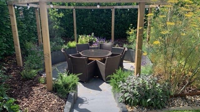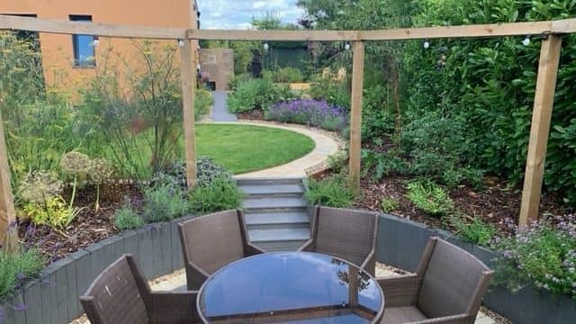 At the heart of the design is a large wildlife pond, nestled beside the main patio and surrounded by lush, layered planting that draws in birds, bees, and dragonflies. The garden’s layout is based on interlocking circles, creating a sense of flow and connection between each area.