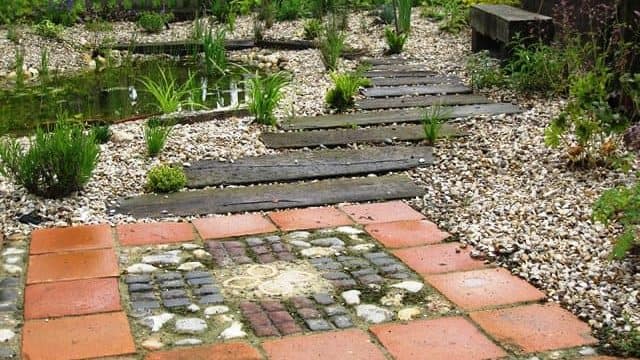 Showcasing the thoughtful use of reclaimed and locally sourced materials, the garden blends seamlessly with the building’s brick-and-flint heritage. A path made from weathered railway sleepers leads to a peaceful wildlife pond, framed by gravel planting chosen for its low-maintenance charm and year-round interest.